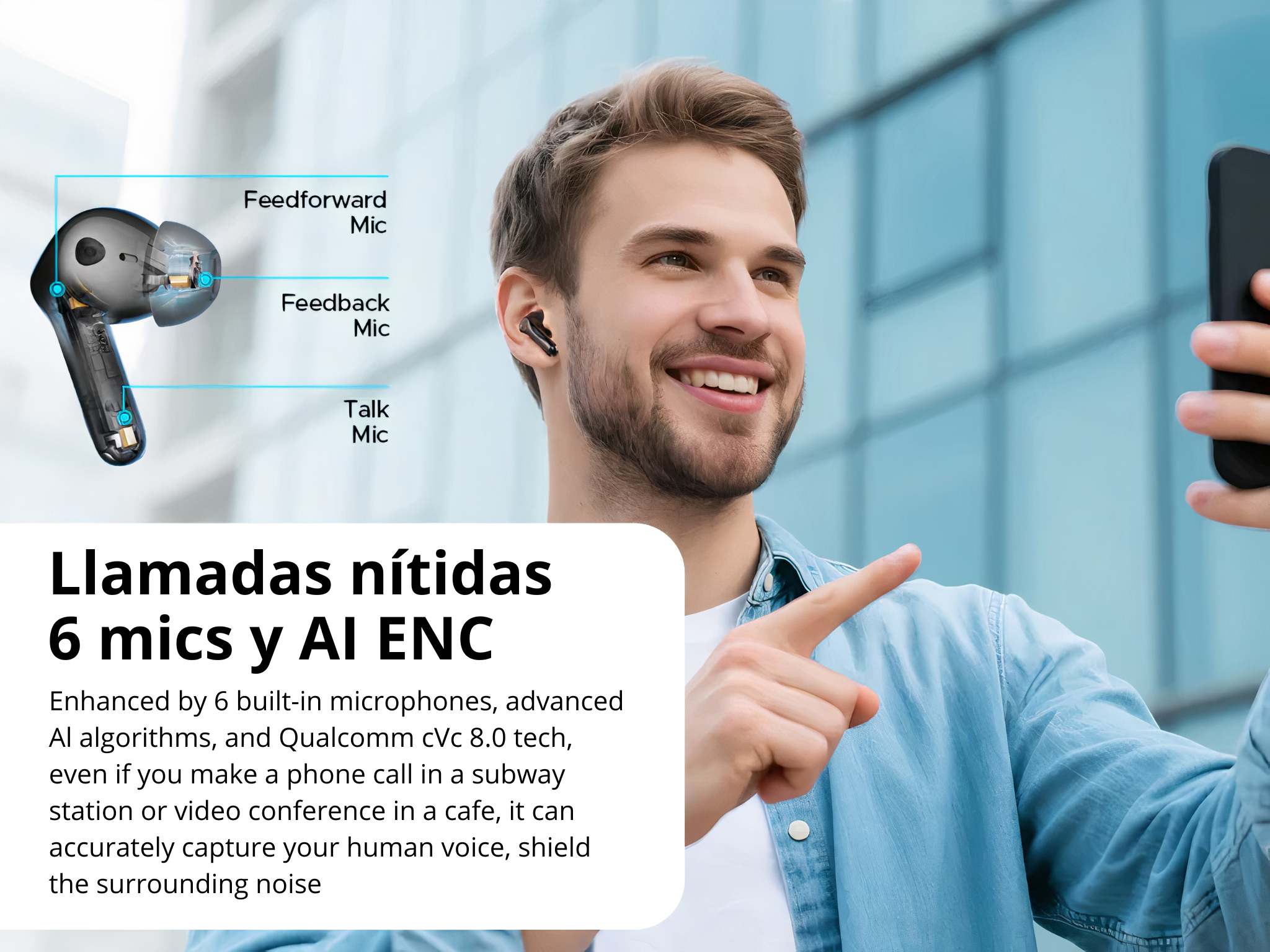 Mientras que la ANC bloquea el mundo exterior, nuestra matriz de 6 micrófonos con ENC mejorada con IA garantiza que se te oiga alto y claro. Aísla tu voz del viento y del ruido de fondo, por lo que, tanto si estás hablando por teléfono, dando una orden de voz o en un chat de vídeo, cada palabra se oye con naturalidad.