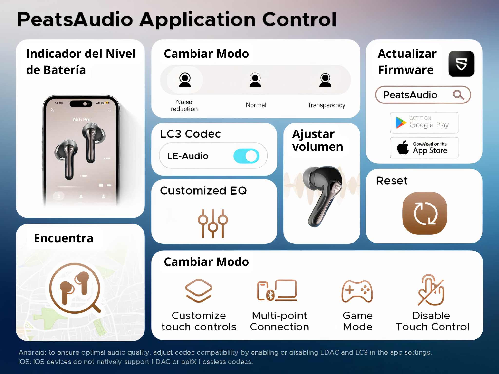 Aprovecha todo el potencial de Air5 Pro con la aplicación PeatsAudio. Cambia fácilmente entre los modos de cancelación de ruido, activa el modo Juego y gestiona conexiones multipunto. Ajusta tu experiencia auditiva con controles táctiles personalizables y un ecualizador integrado con preajustes configurables.